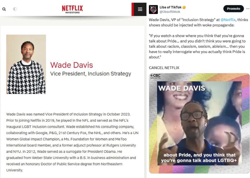 Individuals like Wade Davis, the Vice President of “Inclusion Strategy” at Netflix, who formerly served as an “LGBT inclusion consultant” for the NFL and worked on Barack Obama’s Campaign.