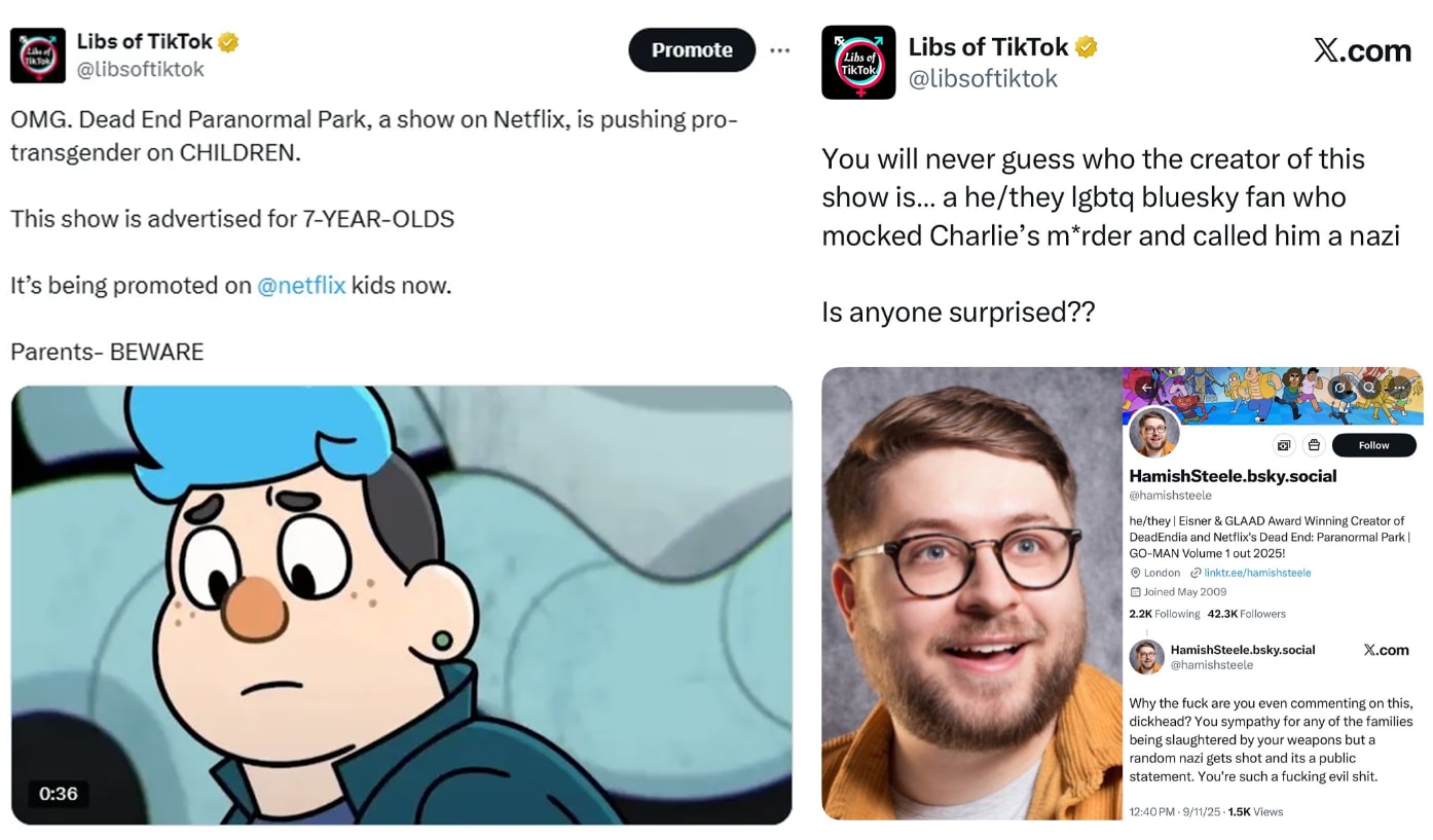 It all began earlier this week after Libs of TikTok posted about a children’s show on Netflix called Dead End Paranormal Park, which featured a character that came out as “transgender.”