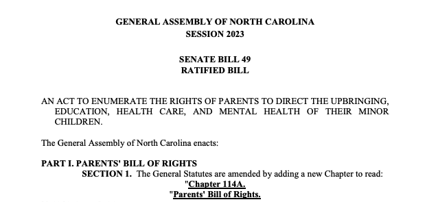 In 2023, North Carolina passed SB 49, also known as the Parental Rights Bill, which guarantees parents the right to opt out of gender ideology propaganda lessons, allows parents to review school textbooks, and gives parents access to their child’s records.