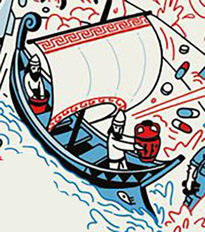 Some visual clues point to the boat being a trimeme from an ancient Mediterranean civilization, such as ancient Sumeria or Phoenicia. These cultures often adorned their boats with eyes to ward off evil and to endow them with a supernatural consciousness to avoid danger.