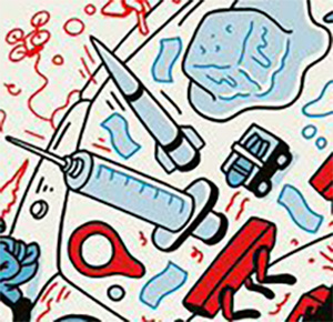 There are two giant syringes on the cover. In both cases, they stand right next to missiles, indicating they can be weaponized. On a related note, the entire cover is filled with an enormous number of pills of all kinds, conveying the fact that the general population is witnessing this chaos from a highly medicated haze. These images combined represent the ever-increasing power of pharmaceutical corporations in society.