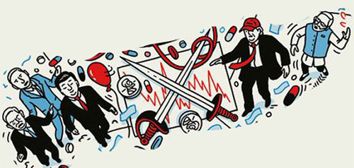 The red line of the graph shows something reaching a historic low. Does it represent the value of the US Dollar (there are pennies around the graph), the stock market, or the economy in general? The two swords above the chart suggest that the negative numbers may be due to trade wars. On each side of that graph are heads of state such as Xi Jinping and Trump, who all appear to be on shaky ground and struggling to remain standing.