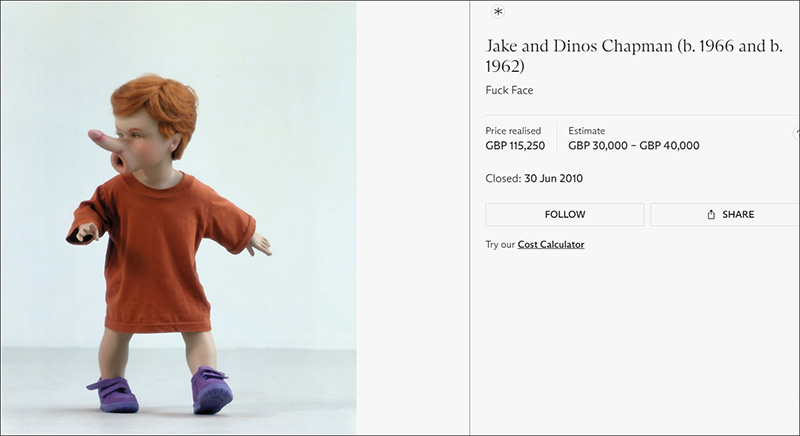 Searching for “Chapman” on the Christie’s website is a disturbing experience. Not only does one find some of the worst “art” ever made, but also the ridiculous amounts of money people paid to own these things.