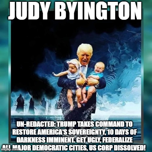 Judy Byington: Un-Redacted: Trump Takes Command to Restore America’s Sovereignty, 10 Days of Darkness Imminent. Get UGLY, Federalize all Major Democratic Cities, US Corp Dissolved!
