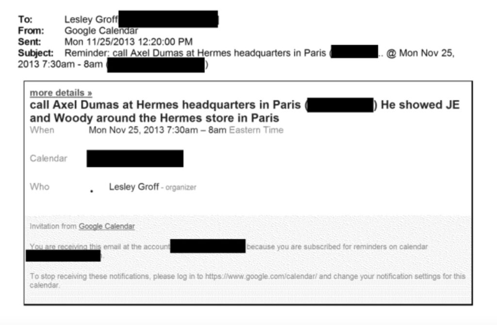 On November 20, 2013, Jeffrey Epstein finally had the opportunity to see Axel Dumas again in Paris, during a performance by the artist and actress Tilda Swinton at the Paris Fashion Museum. Among high society, this kind of encounter is common. But the very next day, the American contacted the secretary of the head of Hermès. While the latter’s assistant replied that he would be unable to meet with him soon due to his schedule, a call was clearly arranged for four days later, along with a visit to one of the Hermès stores, again in the presence of Woody Allen (see email below).