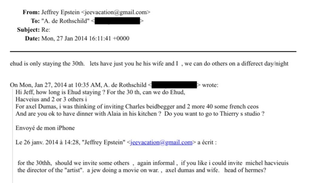 Two days later, Epstein changed his mind about the circumstances of the meeting and decided to invite Axel Dumas to a more relaxed dinner at Ariane de Rothschild’s home on January 30, this time around 8:30 p.m., in the company of former Israeli Prime Minister Ehud Barak. In emails exchanged on January 27 with Ariane de Rothschild (see below), Jeffrey Epstein now proposed organising a group, “informal” dinner, notably with film director Michel Hazanavicius, but also with “Axel Dumas and his wife .” In response, his host also suggested inviting businessman Charles Beigbeder and ” two other CEOs in their forties. “