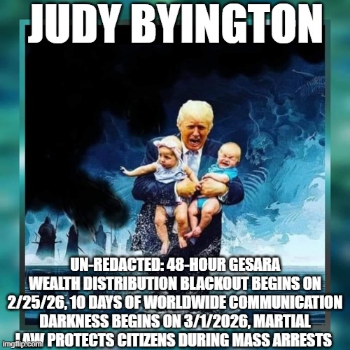 Judy Byington: Un-Redacted: 48-Hour GESARA Wealth Distribution Blackout Begins on 2/25/26, 10 Days of Worldwide Communication Darkness Begins on 3/1/2026, Martial Law Protects Citizens During Mass Arrests (Video)