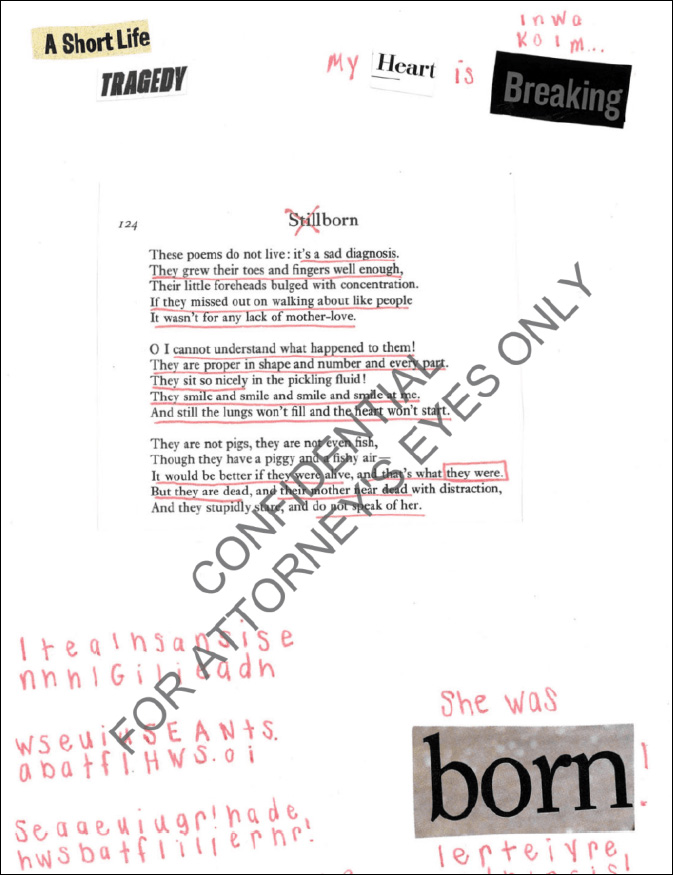 On the page is glued a poem titled Stillborn. The girl drew an X through the word “Still” because her baby had been born.