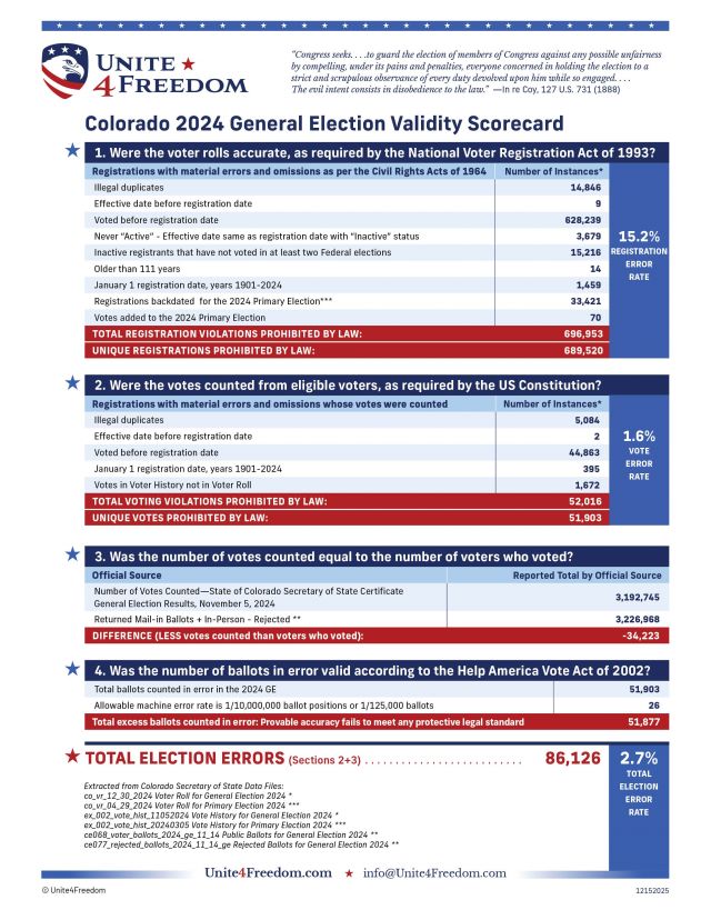 Unite4Freedom analyses are evidence of a potential crime at the highest levels of Colorado government. We the People demand a full criminal investigation, and that Tina Peters be set free by Federal action pending the outcome of that investigation.