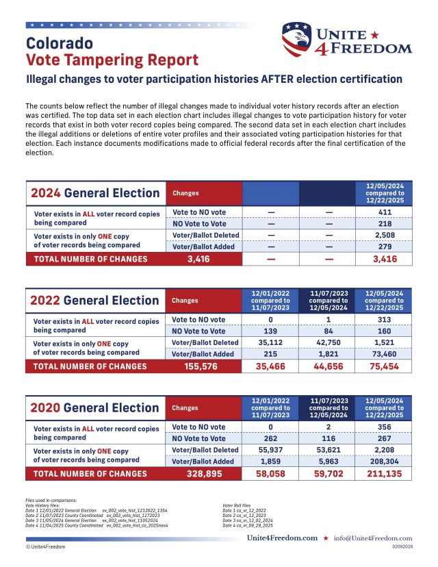The Unite4Freedom Colorado Vote Tampering Report is clear—illegal changes were made to individual voter history records AFTER certification of the 2020, 2022, and 2024 elections. Tina knew something was wrong, and we have the evidence to prove it.