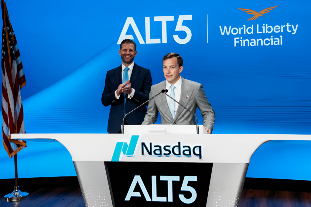 IMAGE: Zach Witkoff, son of Steve Witkoff, President Trump’s special envoy to the Middel east, and Co-Founder and CEO of World Liberty Financial, delivers remarks, as Eric Trump applauds, before ringing the opening bell to celebrate the closing of ALT5’s $1.5 billion offering (Source: Reuters)