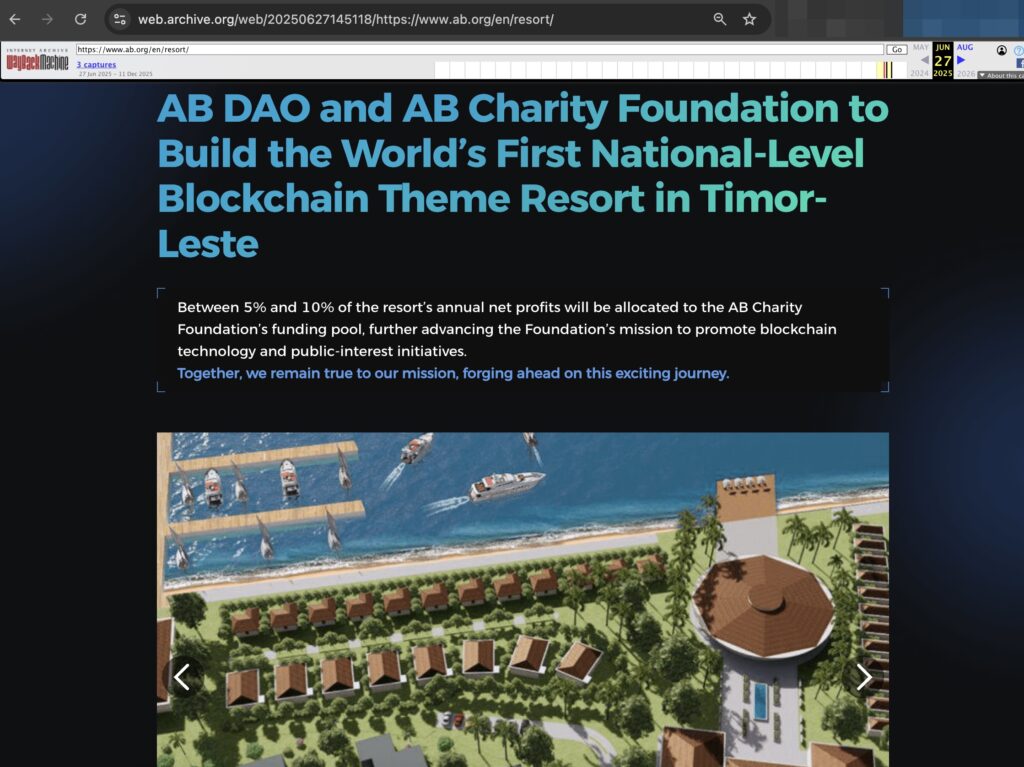 AB did not sell Timor-Leste a modest side project. In its own promotional material, the network bragged that “AB DAO, in partnership with the AB Charity Foundation, and together with the Government of Timor-Leste, is co‑developing the world’s first national‑level blockchain‑themed resort,” framing the scheme as a kind of state‑branded crypto showcase rather than a speculative bet on a beach.