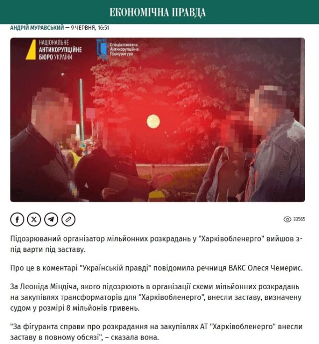 NABU and SAP have announced that they suspect the organizer of a scheme involving millions in embezzlement from the purchase of energy equipment by Kharkivoblenergo JSC. This was reported by the NABU press service. According to a source in law enforcement agencies, the suspect is a relative of Timur Mindich, co-owner of Kvartal 95”, says an article on Ekonomichna Pravda.