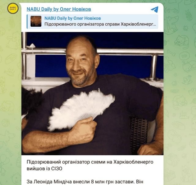 Leonid Mindich, who is suspected of organizing a corruption scheme at “Kharkivoblenergo”, was released from pre-trial detention after posting bail of 8 million UAH, journalist Oleg Novikov reported. NABU and SAP consider him the organizer of a scheme to misappropriate over 12.5 million UAH and attempt to misappropriate an additional 120 million UAH of Kharkivoblenergo’s funds during the procurement of transformer equipment and electrical measuring instruments”, Interfax reports.