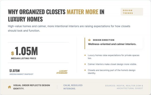 A recent Greater Phoenix-focused article, Why Luxury Home Organization Is Becoming a Bigger Priority Across Greater Phoenix, framed this change as part of a wider movement in the local luxury market. Its central argument was that affluent homeowners are increasingly treating organization as part of home presentation, everyday efficiency, and interior quality rather than as a back-of-house concern. That local framing matters because it shows how the closet is being drawn into the broader conversation about how premium homes should perform.