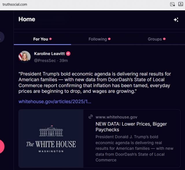 My response to WHITE HOUSE SPOKESPERSON post on Truth Social about Economy now finally BACK ON TRACK, things improving, and IF the SCHUMER SHUTDOWN would end they could get back to the business of putting in place even more GREAT ECONOMIC POLICY through Congress toward (we will have soon, takes some time for policy to kick in) NEW GOLDEN AGE (a new ROARING 20′s, just like was in 1920′s)!!!
