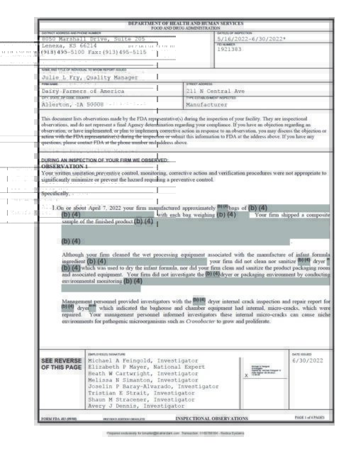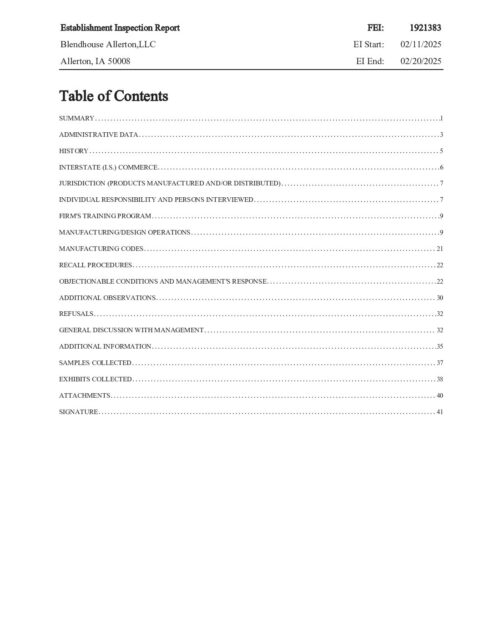 Inspection Report 2024 (483 not issued and Exhibits not provided) – “There were numerous complaints regarding product quality and some specifically mentioning issues like spitting-up and diarrhea.” “Although I did not uncover any significant negative findings during the inspection, the next investigator may discover issues or conditions that were not addressed during this inspection.”