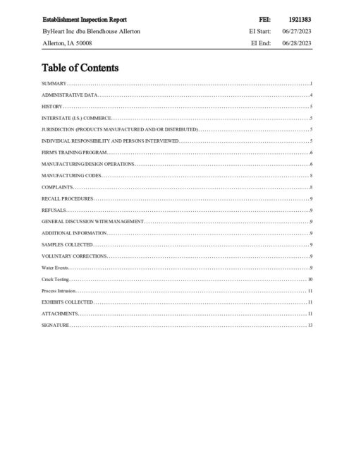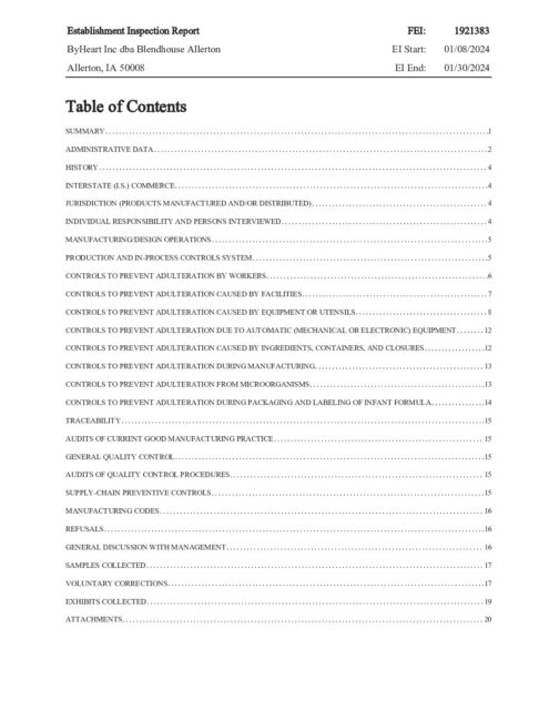 Inspection Report 2023 (483 not provided and Exhibits not provided) – “You did not maintain a building used in the manufacture, processing, packing or holding of infant formula in a plain and sanitary condition.” “In informed all parties that continuous improvement and routine maintenance of the aging facility would be vital to prevent contamination of the powered infant formula supply.”