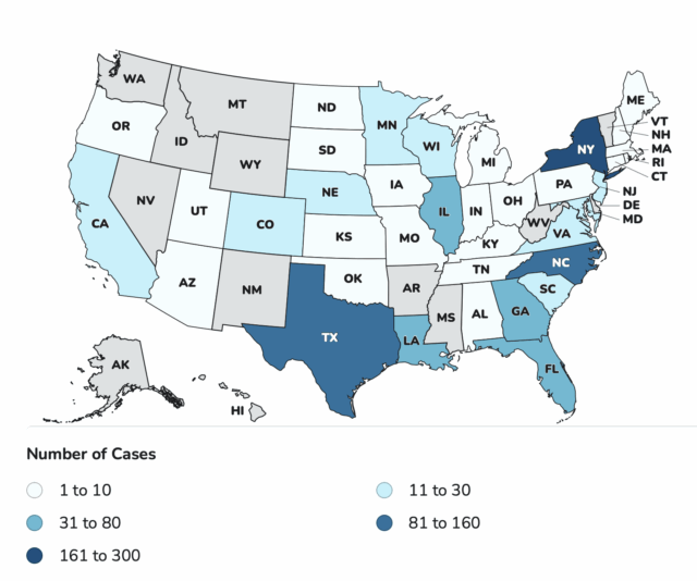 Sick people ranged in age from 1 to 90 years, with a median age of 49, and 55% were female. The median illness onset date was June 29, 2025 (range: May 1 – August 31). Of 990 people with information available, 93 were hospitalized. No deaths have been reported.