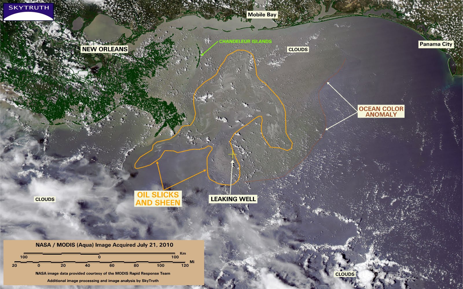 On June 29, when Tropical Storm Alex was moving past in the southern Gulf, the area of slicks on satellite images spanned 19,000 square miles; the MODIS / Aqua image below, taken on July 21, shows a fragmented area of slicks and sheen covering 5,476 square miles: