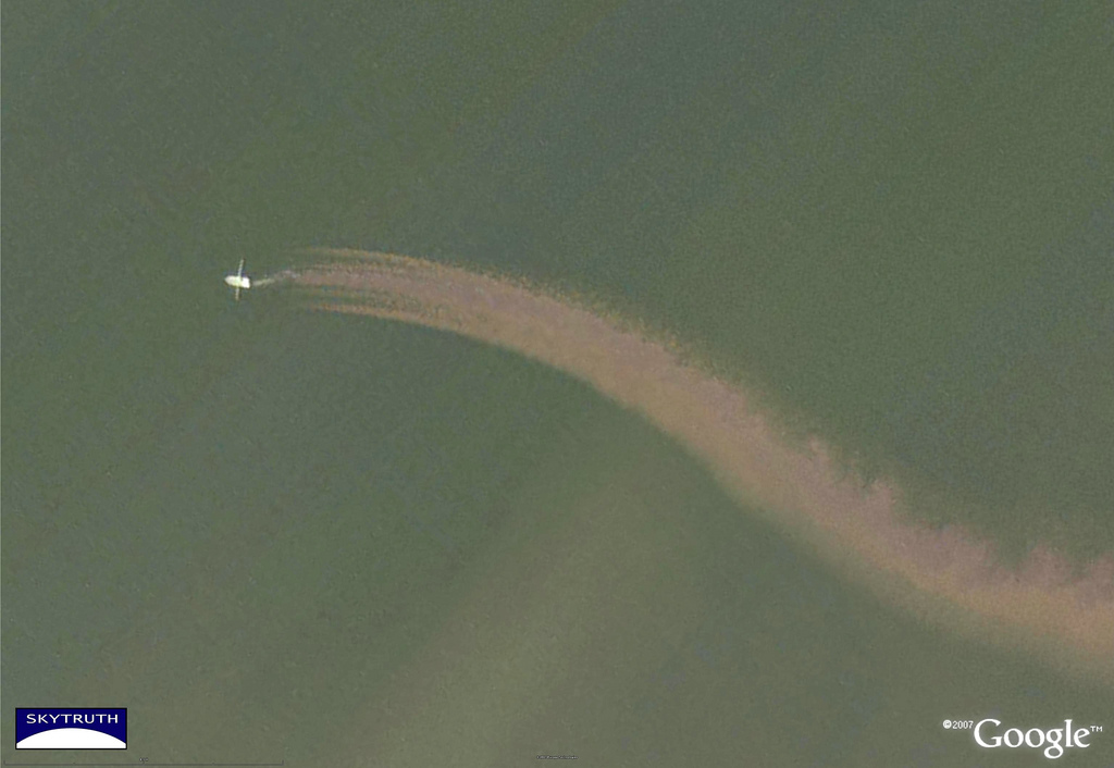 At SkyTruth we’re concerned that fishing activity could potentially stir up any oil that’s sitting on the seafloor, resuspending it in the water column. We don’t know if that’s what has happened near Southwest Pass. But we do know that bottom-trawling for shrimp in the Gulf routinely churns up the muddy seafloor, creating long sediment-laden plumes that trail for miles behind the trawlers and can be seen on satellite images. Check out our gallery of trawling images, and read more about it on this blog.