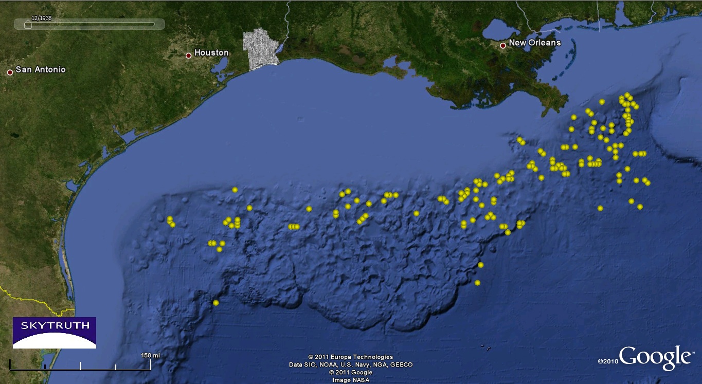 Deepwater oil and gas wells (yellow dots)