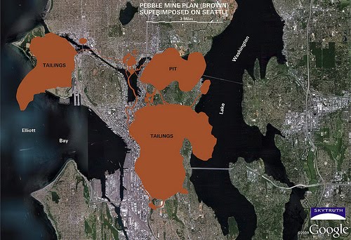 Do you have experience with Photoshop? We’re looking for some experienced Photoshoppers to assist us in projects such as the one we worked on for the Pebble Mine in Alaska. That photo gallery is located in our Hard Rock Mining collection in Flickr. What we did with the images below is superimpose the proposed Pebble Mine onto an area the size of Seattle, WA and Anchorage, AK to give folks an idea of the sheer size of the mine. We’d like to do more work like this, simulating what a proposed mine would look like, using 3D graphics and Photoshop.