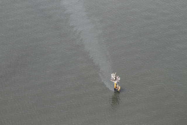 Here is a small gallery of photos of the slick near Venice taken during today’s Gulf Monitoring Consortium overflight. This definitely looks like an oil slick, and it looks like our friends at SouthWings and Gulf Restoration Network may have pinned down the source – this slick is obviously emanating from a small, unmanned platform. We’re trying to get the GPS coordinates from the flight so we can nail down the platform ID. Stay tuned.