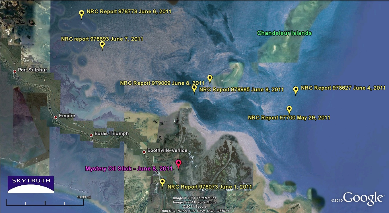 At SkyTruth we’re systematically mapping the official pollution reports collected by the National Response Center for the entire US, onshore and off (polluters are required by law to report their pollution immediately to the NRC; passers-by are encouraged, but not required, to report any signs of pollution). This map shows all of the NRC reports in the area since May 29.  You can use the report numbers to look them up on the NRC’s website.