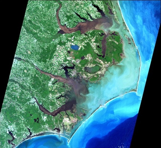 Detail from Landsat-7 ETM satellite image of North Carolina’s Outer Banks taken September 23, 1999 in the wake of Hurricane Floyd. |