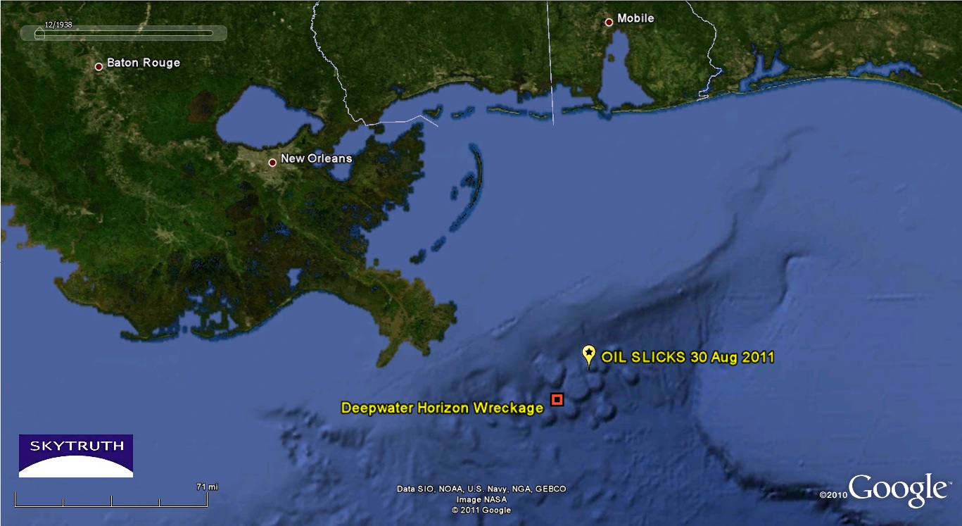 Location of oil slicks documented by Bonny Schumaker on August 30, 2011. BP oil spill site (Deepwater Horizon wreckage) shown for reference. |