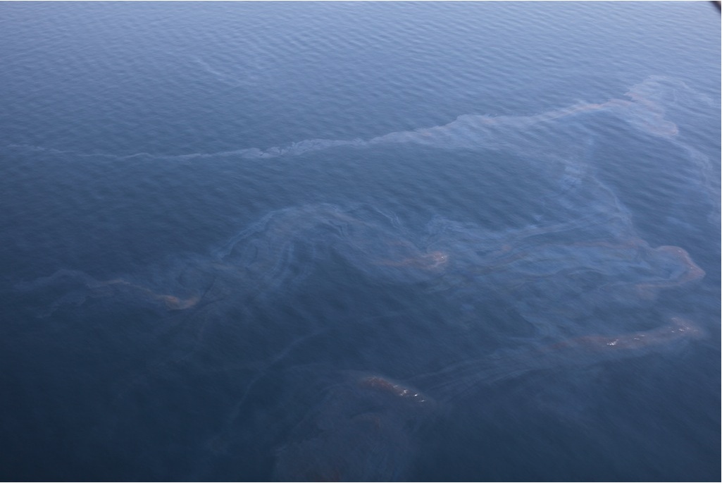 Oil slicks on August 30, 2011 about 16 miles northeast of the BP / Deepwater Horizon spill site. Photograph courtesy Bonny Schumaker / On Wings of Care. |