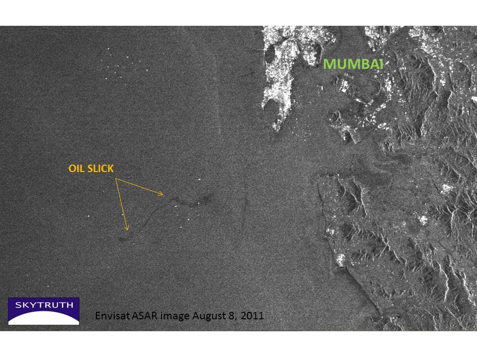 Radar satellite image showing oil slick off Mumbai, India on August 8, 2011. Envisat ASAR image courtesy European Space Agency. |