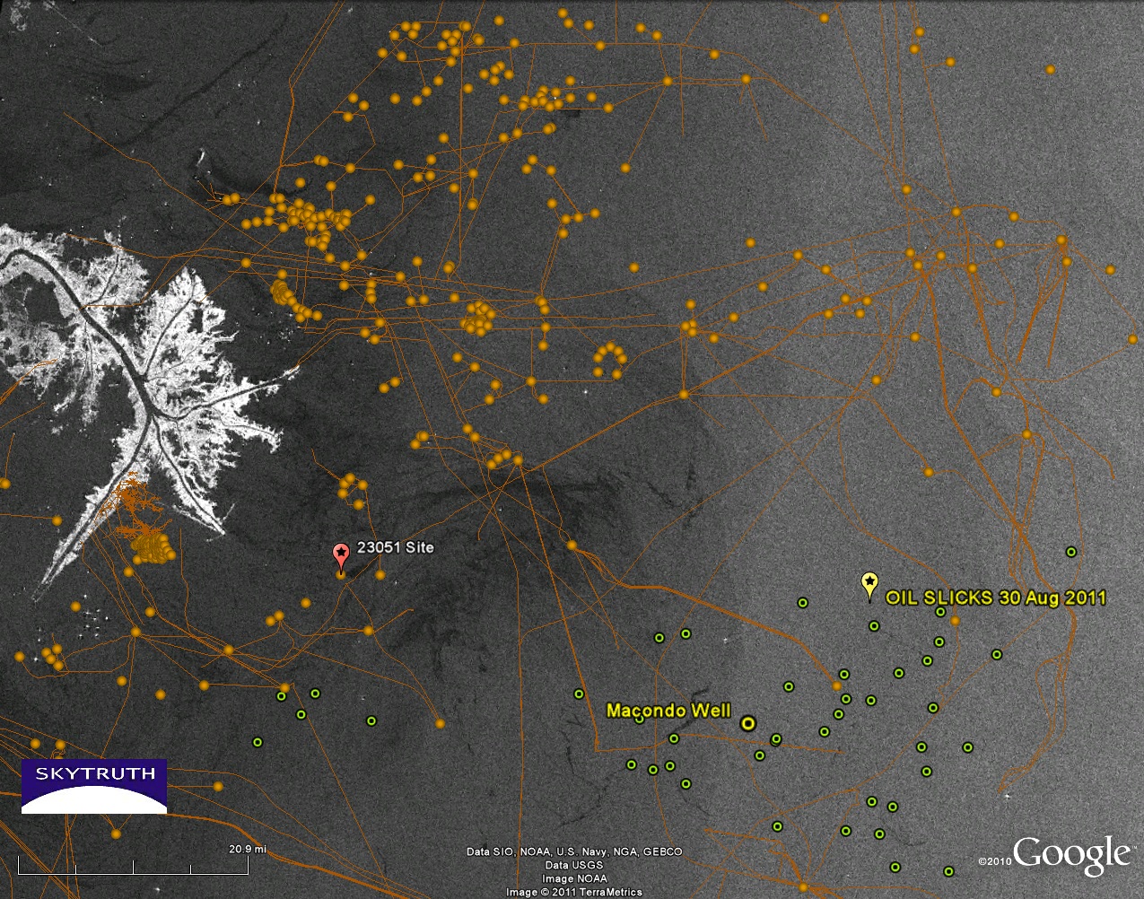 We would be able to observe those slicks on satellite imagery, just like we repeatedly observe slicks from active natural oil seeps throughout much of the Gulf. Radar imagery is the go-to tool for the job. A radar image taken on August 30 showed a patch of slick matching the area and description given by Bonny Schumaker when she flew over that site earlier in the day; an image taken a few days earlier, on August 26, showed nothing interesting in the vicinity.