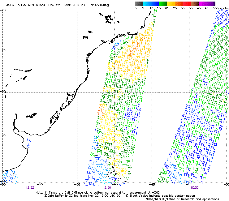 Surface wind speed and direction derived from ASCAT scatterometer data at nearly the same time as the November 22 radar satellite overpass.