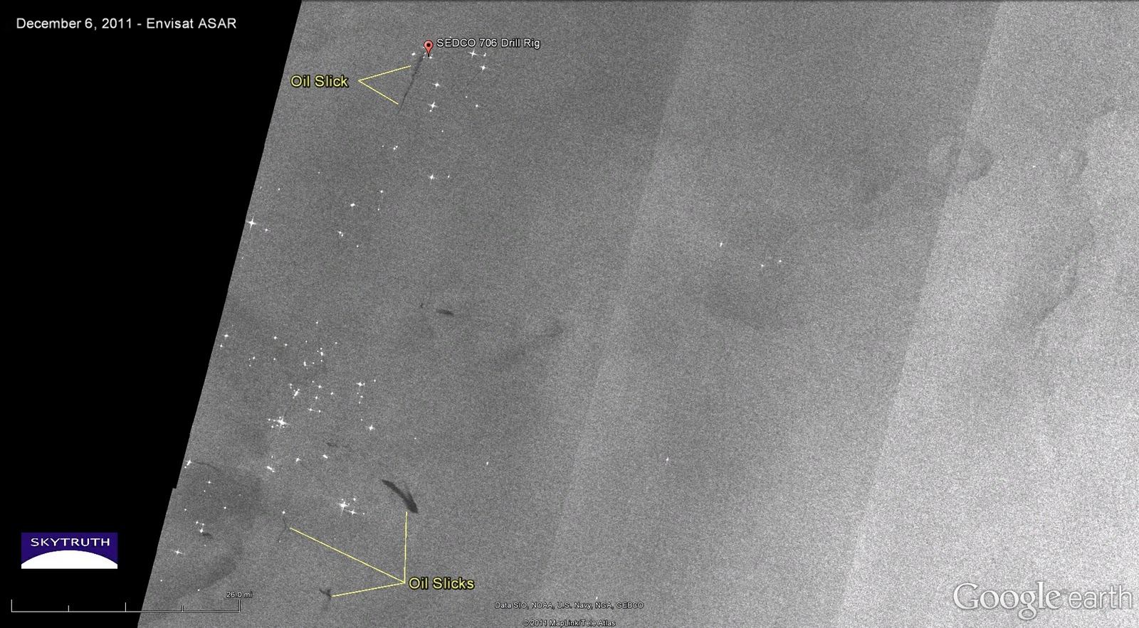 The radar satellite image above, taken on December 6, 2011, shows a very small slick originating near the location of Transocean’s SEDCO 706 drilling rig that was installing Chevron’s failed well. The slick is about 7.3 miles long and a few hundred yard wide, comparable to the slicks created by natural oil seeps in the Gulf of Mexico. Wind conditions were good for slick detection at the time, blowing at about 10 knots (5 meters per second). Several other small slicks are visible near a cluster of oil platforms (bright spots) about 50 miles south of the SEDCO 706. This is within the southern Campos Basin, and these slicks may be the result of minor spills or leaks from platforms, pipelines, or vessels operating in one of the many offshore fields in the region.