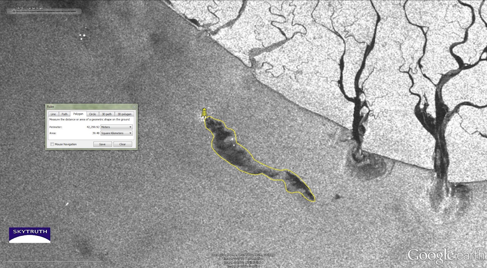 Teri noticed a small slick on today’s Envisat ASAR radar satellite image covering the site of Chevron’s blowout and fire off the coast of Nigeria. We measure it at about 18.6 kilometers long, extending about 39 square kilometers.  It appears to be very thin.  Assuming the slick is, on average, one micron thick, that amounts to about 9,500 gallons of some oily substance — possibly unburned natural gas condensate, since this was reported by Chevron to be a gas exploration well that was not creating any oil slick: