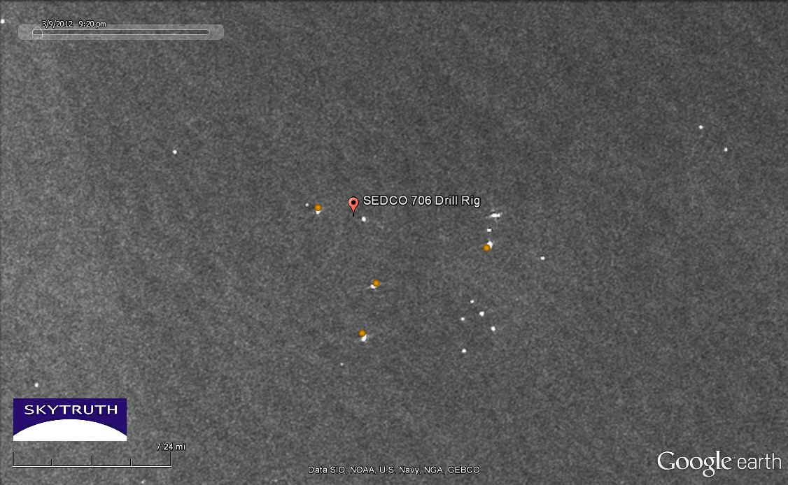But optical satellite imagery of this area (MODIS and MERIS) have had problems with clouds and haze for the past few days, so we haven’t seen any sign of the latest slick. Radar images don’t have that problem, but the most recent radar image we have was taken at about 9pm local time on March 9, and it looks clean around the SEDCO 706 site:
