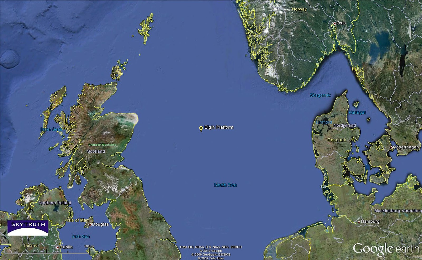 Map showing location of Elgin platform in North Sea, site of ongoing gas well blowout. |