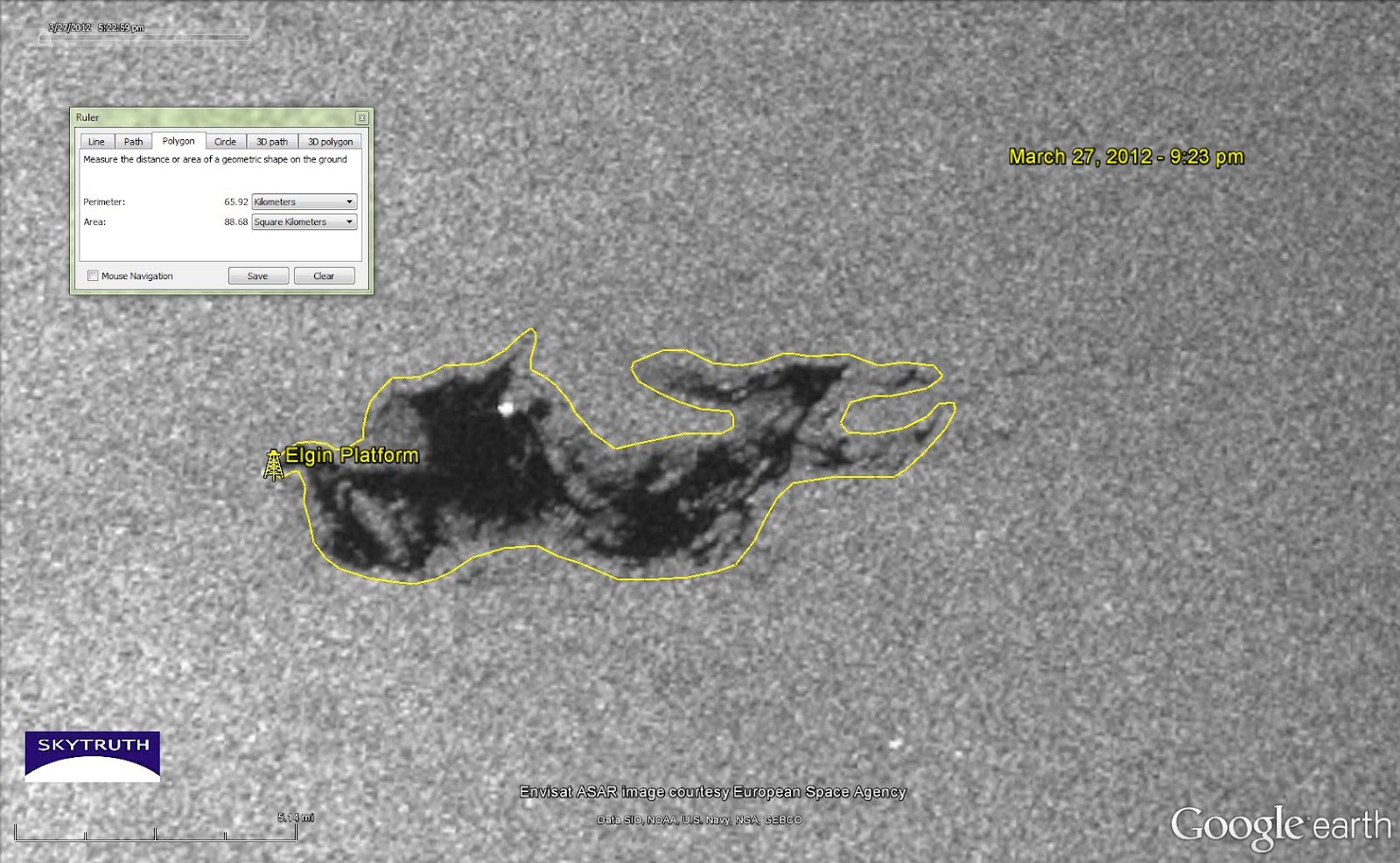 This leak is mostly natural gas escaping into the atmosphere at sea level — something we can’t see on satellite imagery — but a small slick of liquid gas condensate has also been reported at the site. This Envisat ASAR radar satellite image, taken yesterday at about 9:23 pm local time, shows a patchy slick covering about 89 square kilometers (34 square miles). The platform itself appears as a very bright spot on the radar image but it’s covered up by our yellow rig icon marking the location: