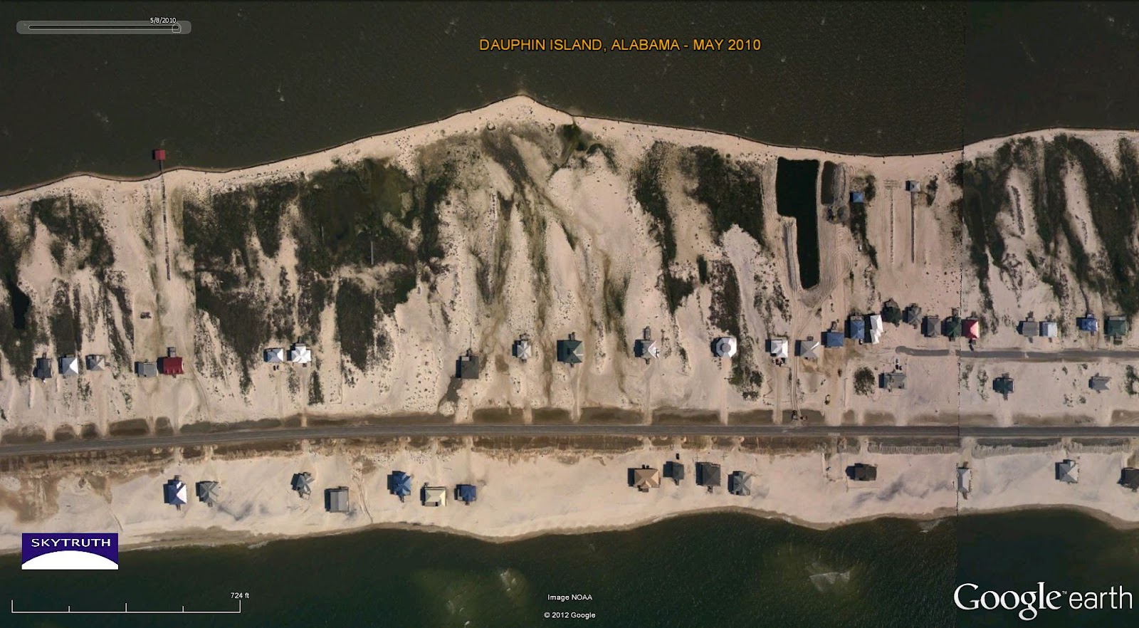 The berm was never needed. Possibly it would have helped if a hurricane came along during the spill, but it’s not clear such a flimsy barrier would survive long under those conditions. What has become apparent is how rapidly and dramatically this action is altering Dauphin Island. 22 pits were dug into the Sound side of the island to excavate the necessary sand. These pits quickly became ponds of standing water. The ponds are steadily eroding and growing to the point where some are now open to the sea, and subject to further erosion by waves and tide. Satellite imagery and aerial survey clearly show how this has progressed, threatening properties on this developed part of the island: