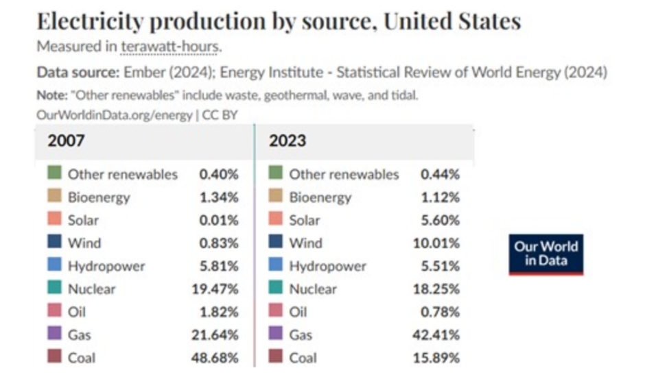 When that Scientific American report was produced in 2010, the American electricity sector was a few years into a major shift to using natural gas rather than coal. In 2007, the historic peak for American CO2 emissions, coal-fired power plants produced 48.7 percent of American electricity, and natural gas just 21.6 percent. By 2023, the mix had flipped to 42.4 percent gas and 15.9 percent coal.
