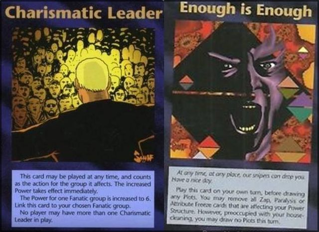 The first card ‘Charismatic Leader’ shows a man speaking to a fanatic crowd with the following text: