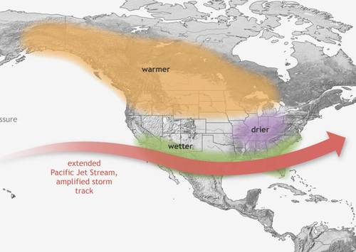 Across the U.S., an El Niño influences seasonal rainfall, especially during winter. The stronger, more active jet stream typically shifts south, bringing wetter-than-average conditions to the southern U.S., including California, the Gulf Coast, and the Mid-South.