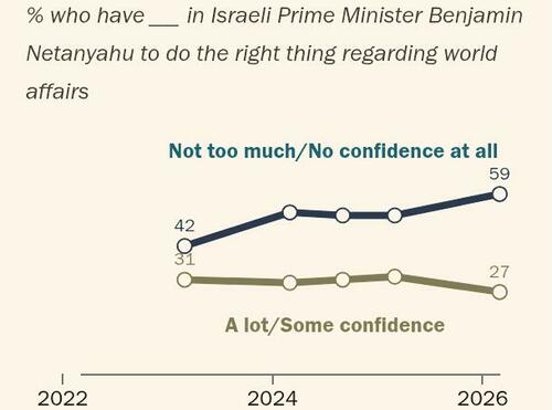 Alongside his country’s sagging standing with the US public, Prime Minister Benjamin Netanyahu is also increasingly unpopular, as 59% of American adults have little or no trust that he will “do the right thing regarding world affairs,” also a seven-point worsening from last year’s finding.