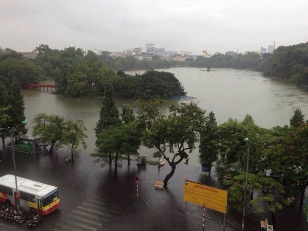 Do ảnh hưởng của cơn bão số 6, mưa lớn khiến Hồ Gươm tại Hà Nội ngập lụt, nước tràn lên các tuyến đường xung quanh. Nhiều cư dân mạng đã ghi lại hình ảnh này