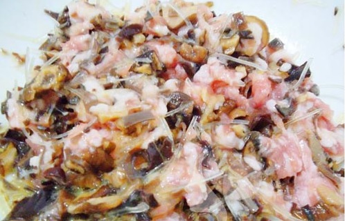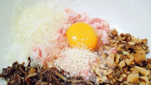 Bước 2: Cho thịt vào bát tô cùng mộc nhĩ, nấm hương, miến thái nhỏ. Đập trứng gà vào cùng ½ thìa bột nêm.