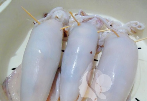 Bước 4: Mực tươi làm sạch để ráo nước. Sau đó nhồi phần hỗn hợp thịt vào bên trong thân mực. Dùng tăm ghim lại.