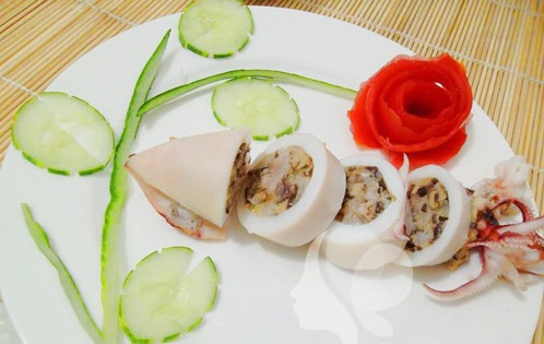 Bước 6: Khi mực nhồi thịt chín, cắt khúc vừa ăn xếp lên đĩa. Trang trí hoa cà chua cùng dưa chuột lên cho món ăn thêm hấp dẫn.